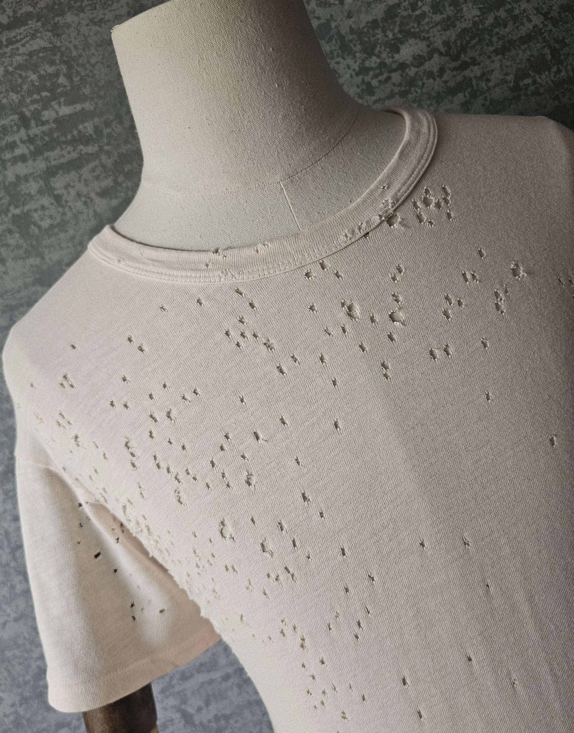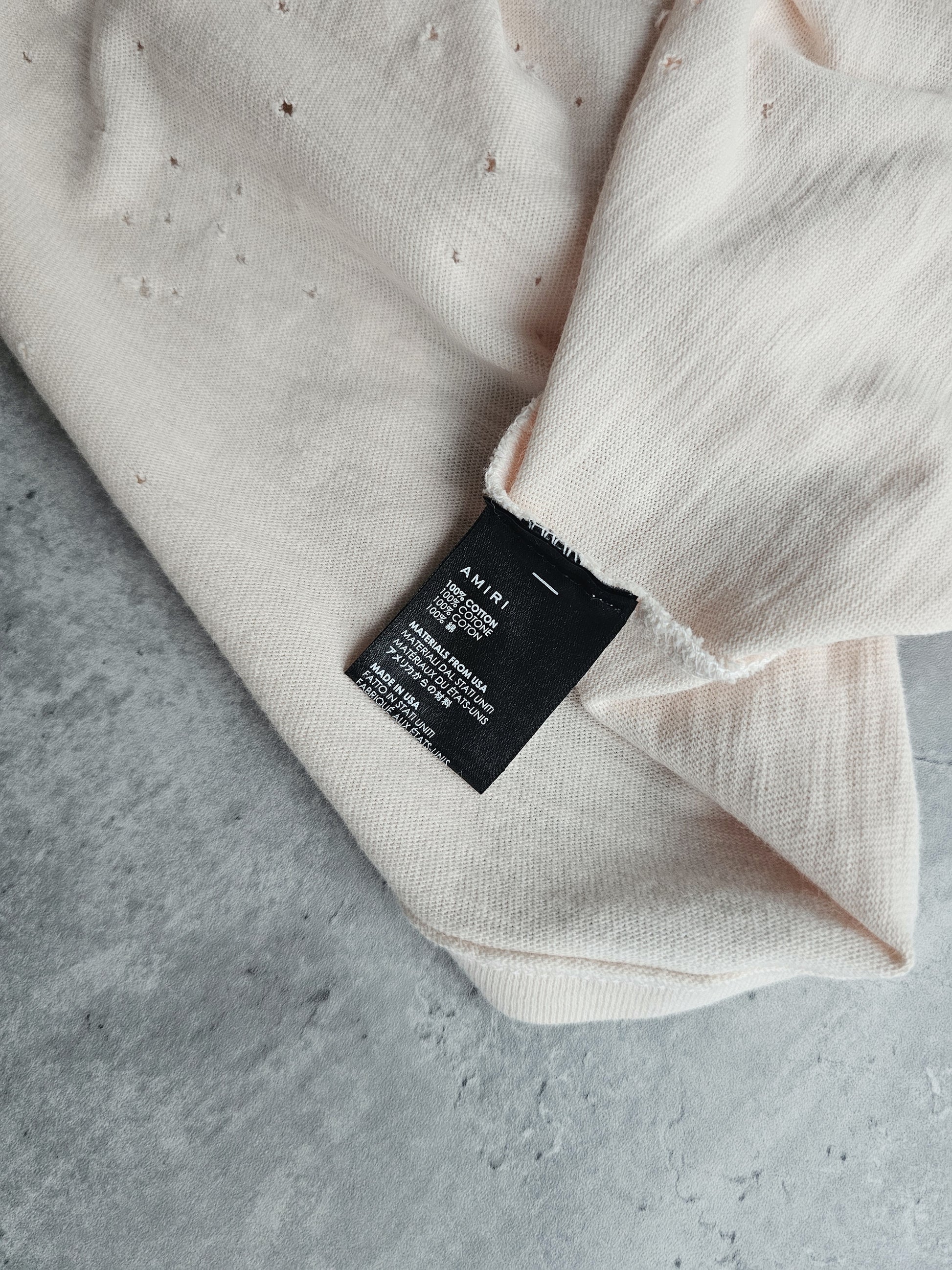 A distinctive Amiri short-sleeve cotton jersey T-shirt in a soft salmon pink tone. Designed with the brand’s signature distressed aesthetic, it features scattered perforation-style detailing that gives the piece a raw, textured look. Subtle yet striking, this T-shirt adds character to a casual outfit while remaining easy to style and versatile.
