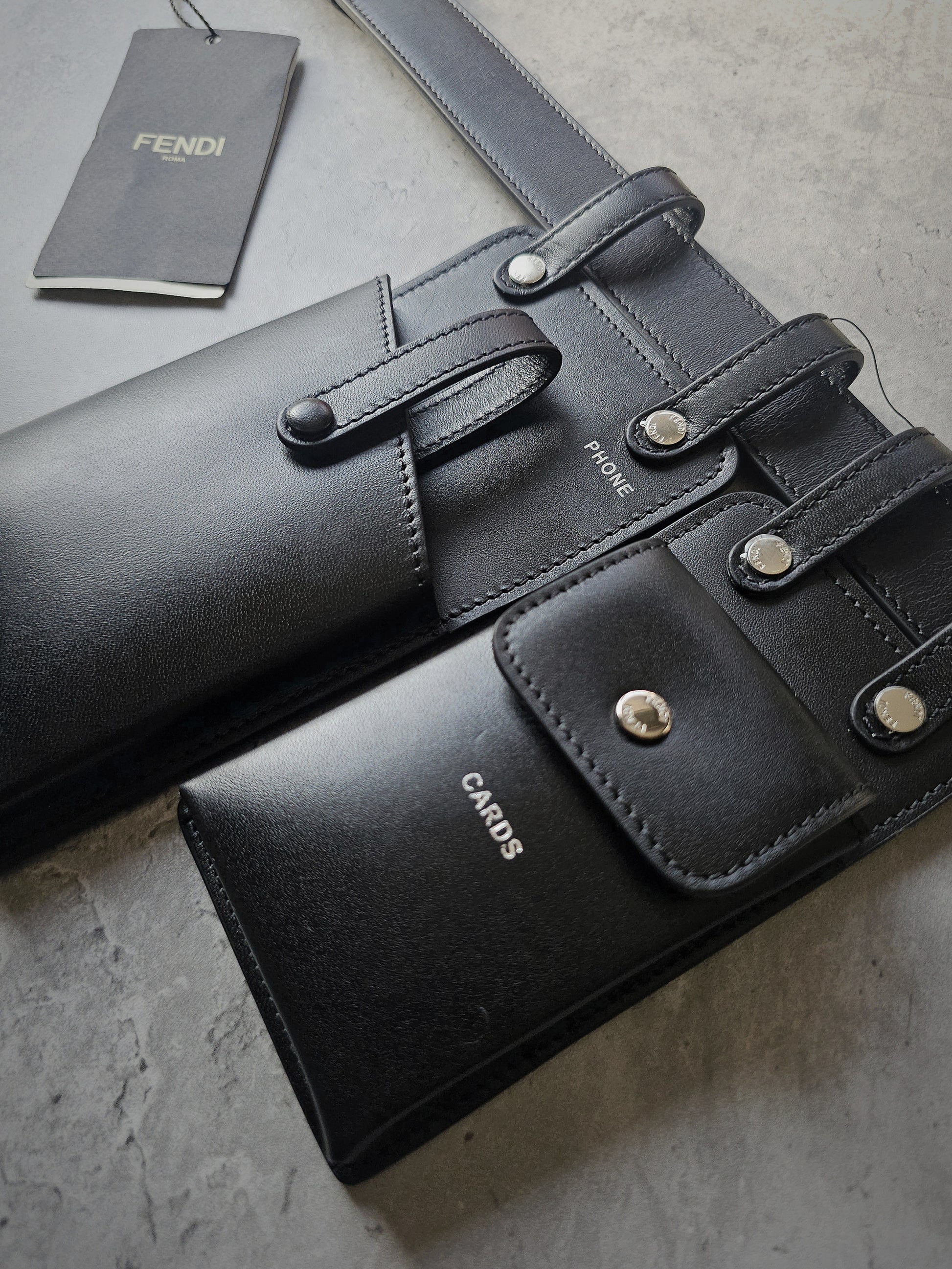 Elevate your accessory collection with the Fendi Glacier Utility Belt, an exemplary synthesis of aesthetic appeal and practicality tailored for the discerning gentleman. Constructed from high-quality black vitello leather, this belt serves as an indispensable companion. It includes two refined detachable pouches: one is specifically designed to accommodate contemporary smartphones, while the other is intended for the secure storage of cards and cash, thus ensuring the organisation of daily essentials.