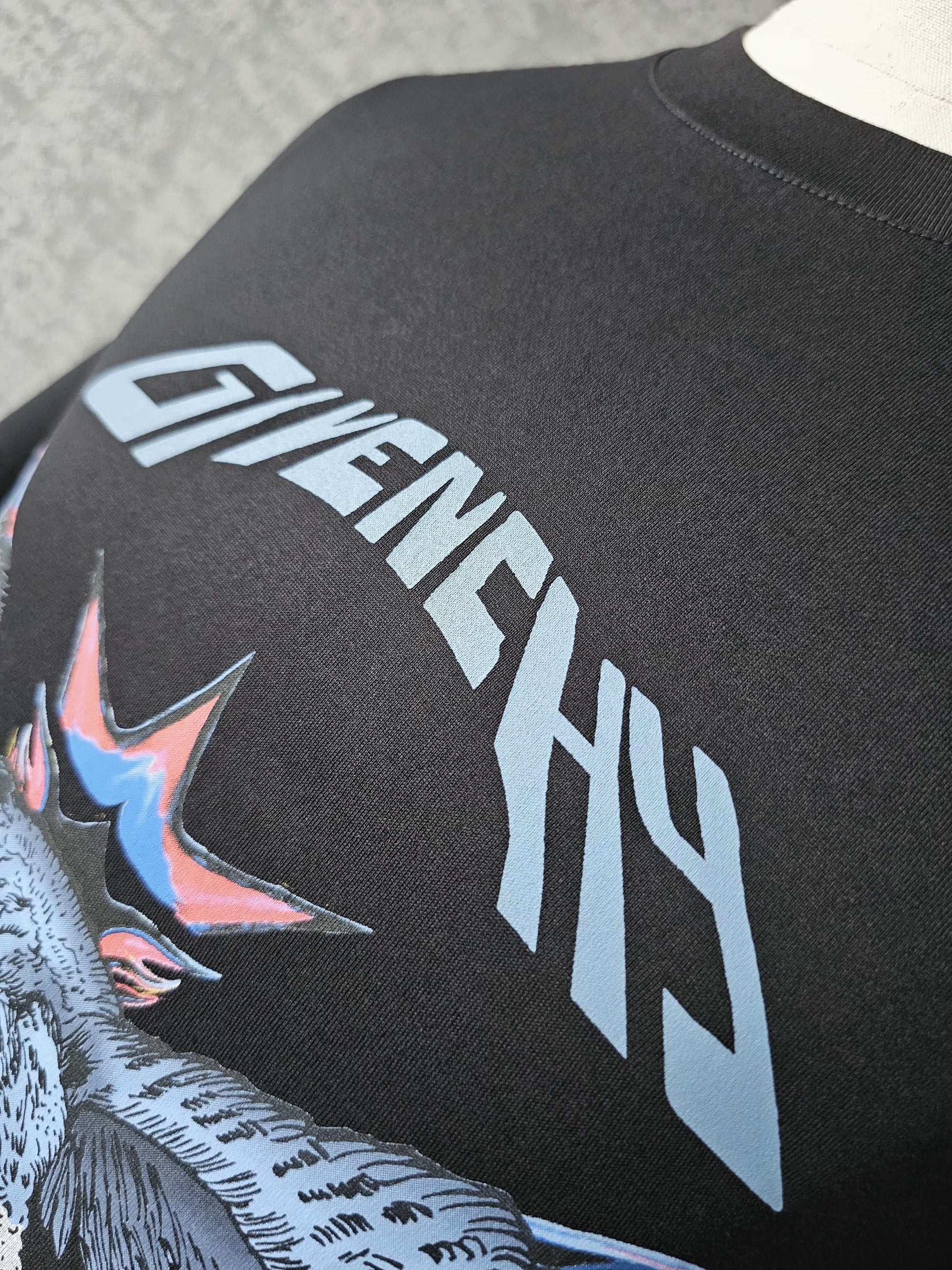 This Givenchy T-shirt draws on the house’s longstanding fascination with bold iconography and graphic symbolism. The eagle motif — a recurring emblem in fashion and heraldry — was used to convey power, movement, and dominance, aligning with Givenchy’s direction during the late-2010s period when strong visual statements were central to the brand’s menswear collections.