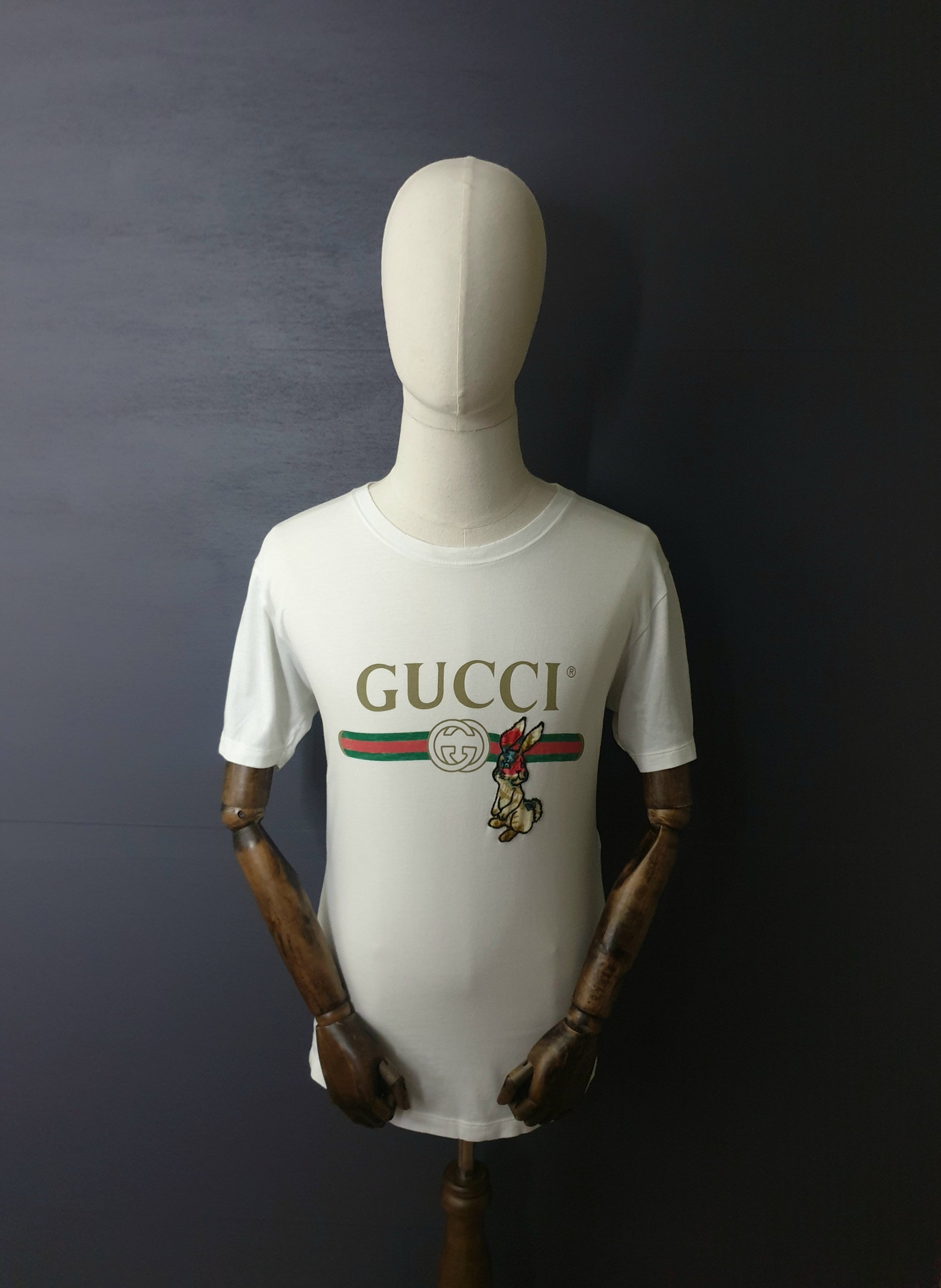 Gucci has taken its iconic GG print to new heights, infusing it with whimsical designs that evoke a sense of childhood nostalgia. The brand's logo on the chest is accentuated with an embroidered white rabbit, adding playfulness to the classic design. But what truly sets this piece apart is the rabbit's eyes, meticulously adorned with rhinestones that glisten when struck by light. The overall effect is nothing short of captivating and is sure to turn heads wherever you go. This Gucci piece is in superb condition, making it an ideal addition to any fashion-forward wardrobe.