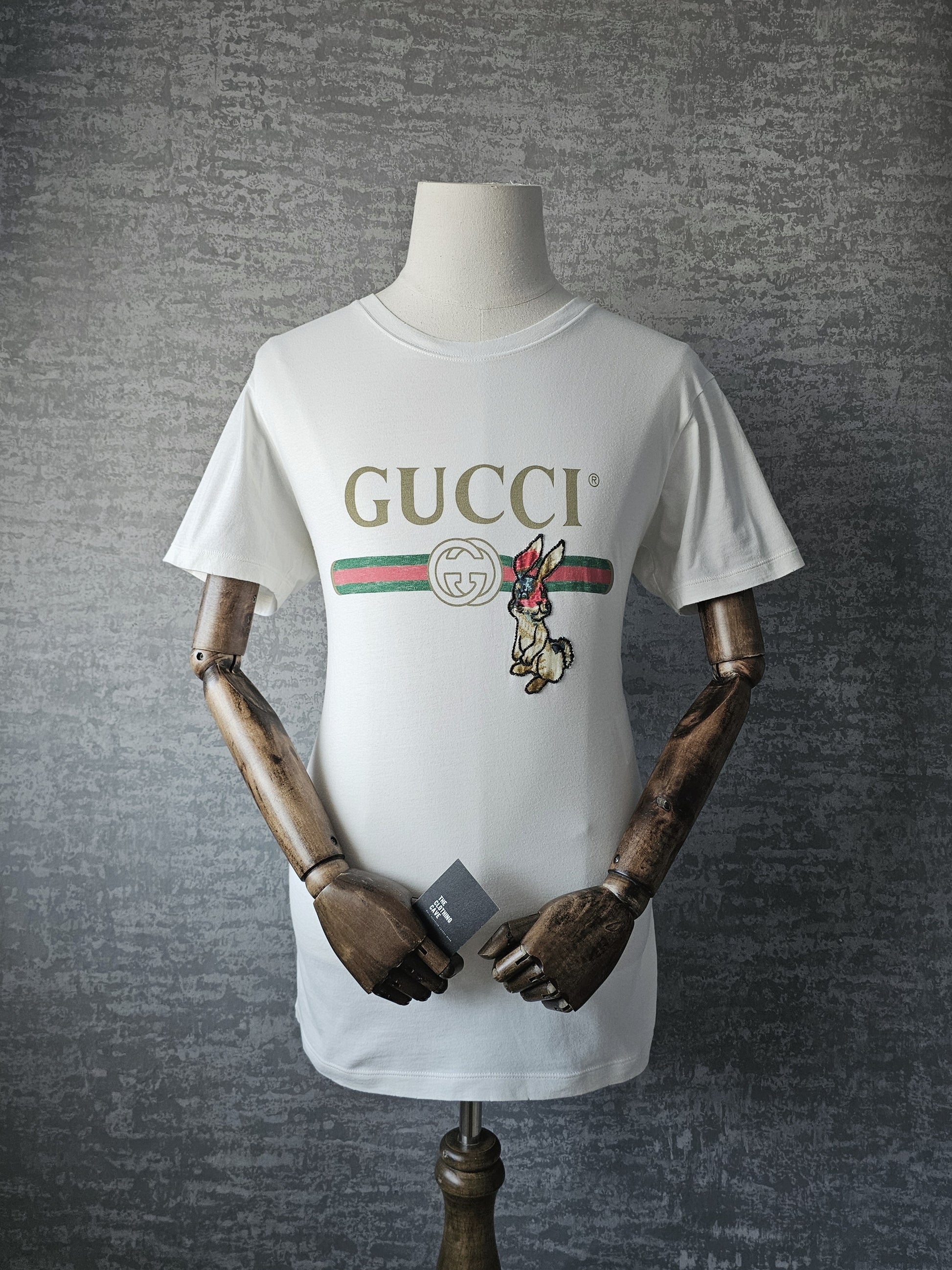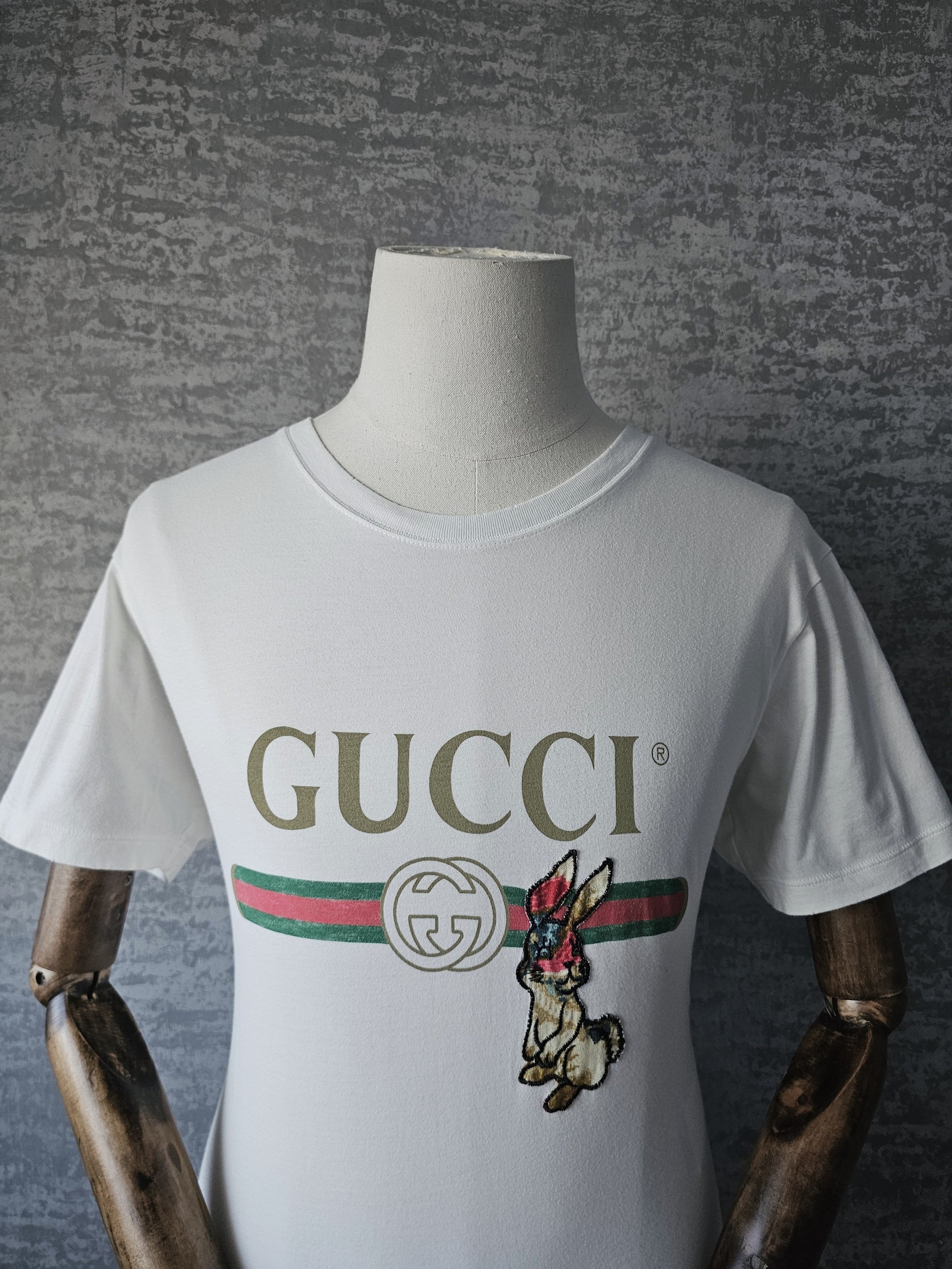 Gucci puts a playful spin on its iconic branding with this white T-shirt, featuring the classic logo and web stripe across the chest. An embroidered rabbit motif adds character, finished with subtle rhinestone detailing to the eyes for a light-catching touch. A distinctive piece that blends heritage Gucci design with a whimsical edge.