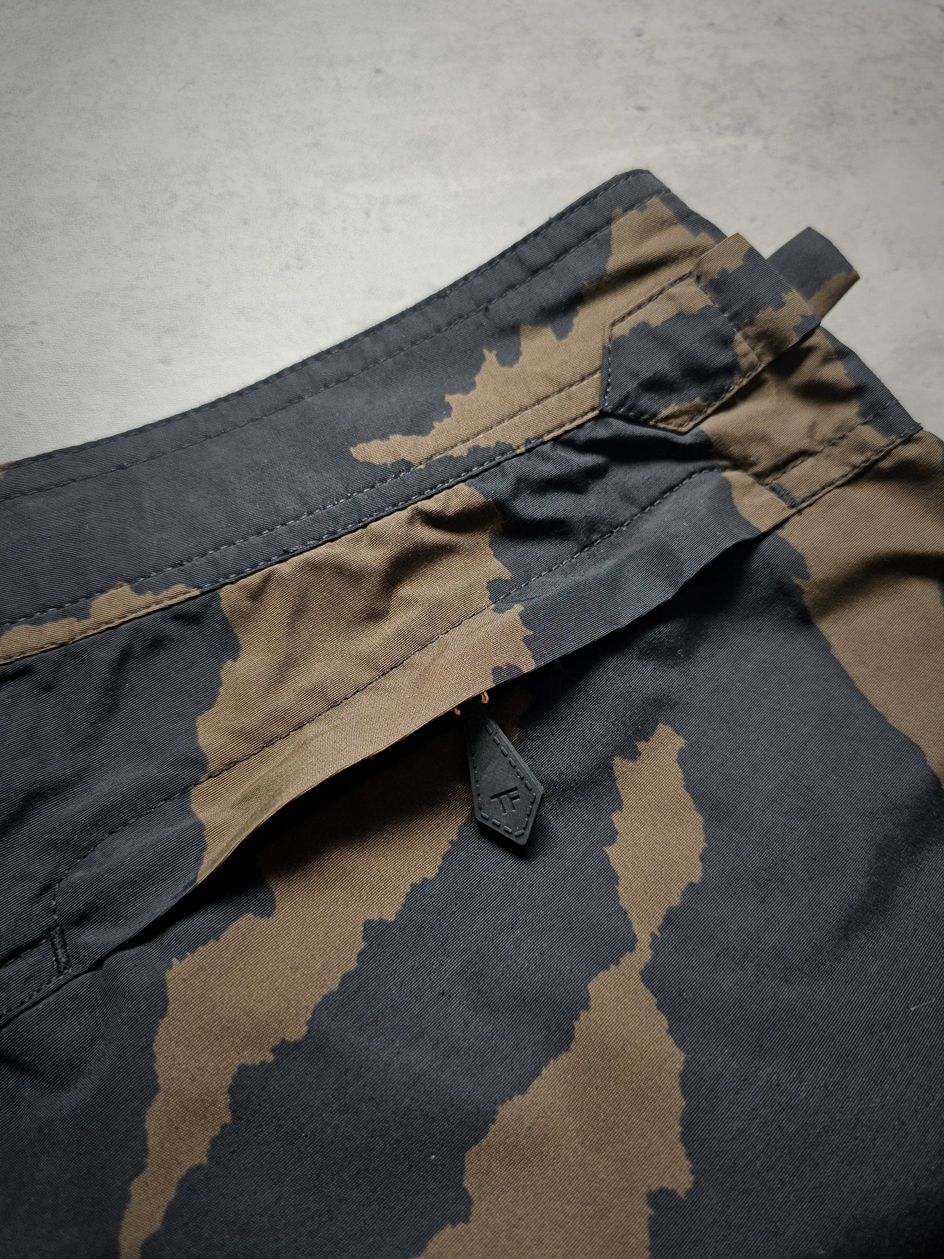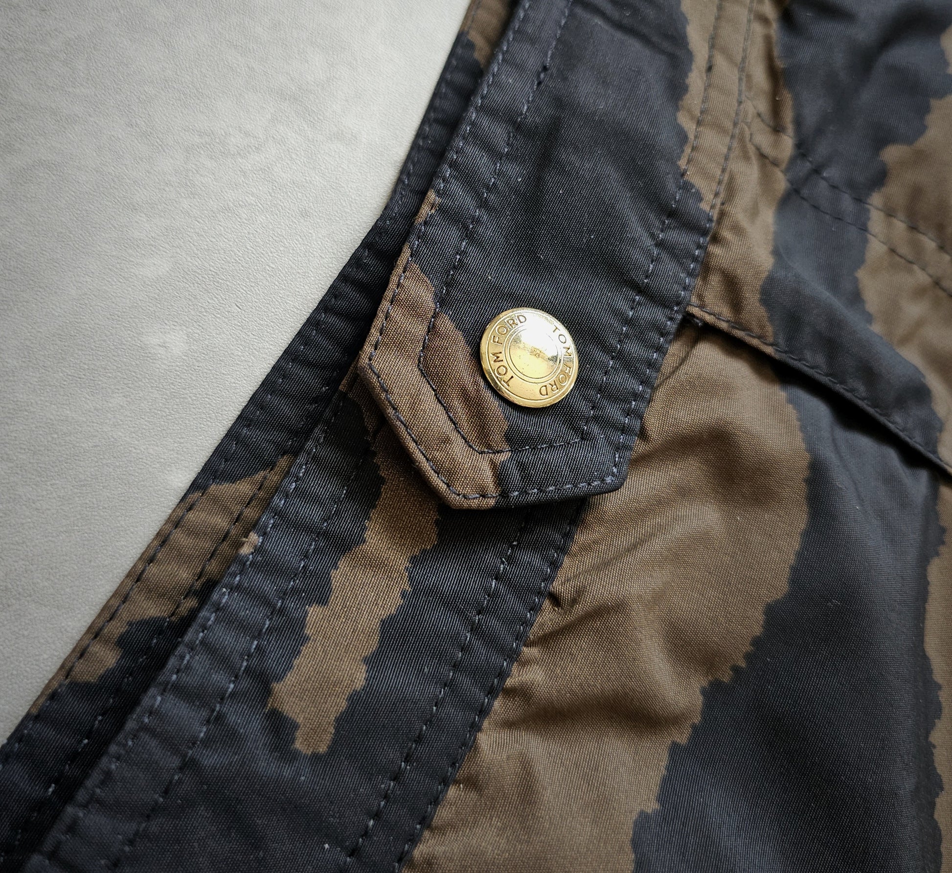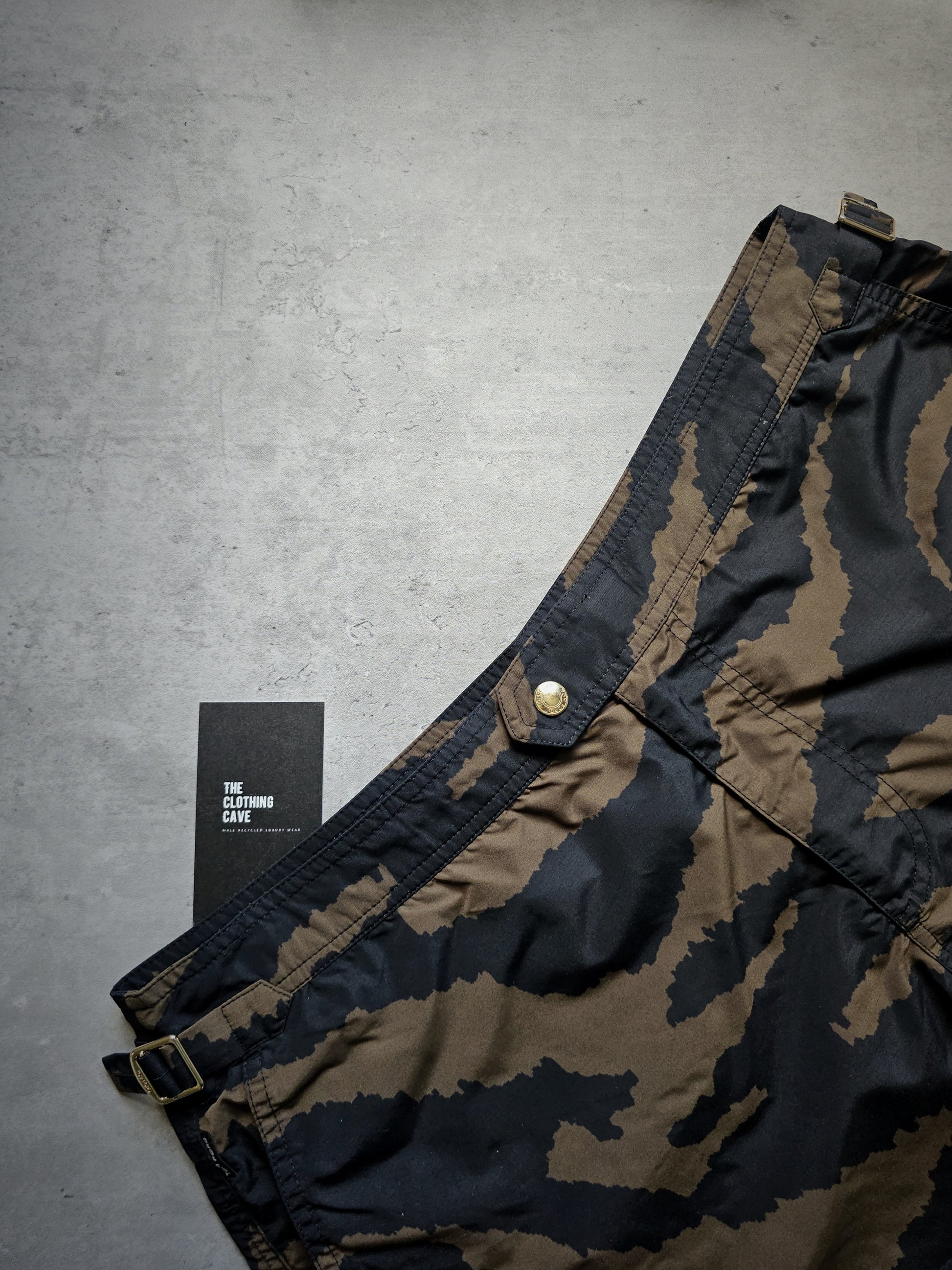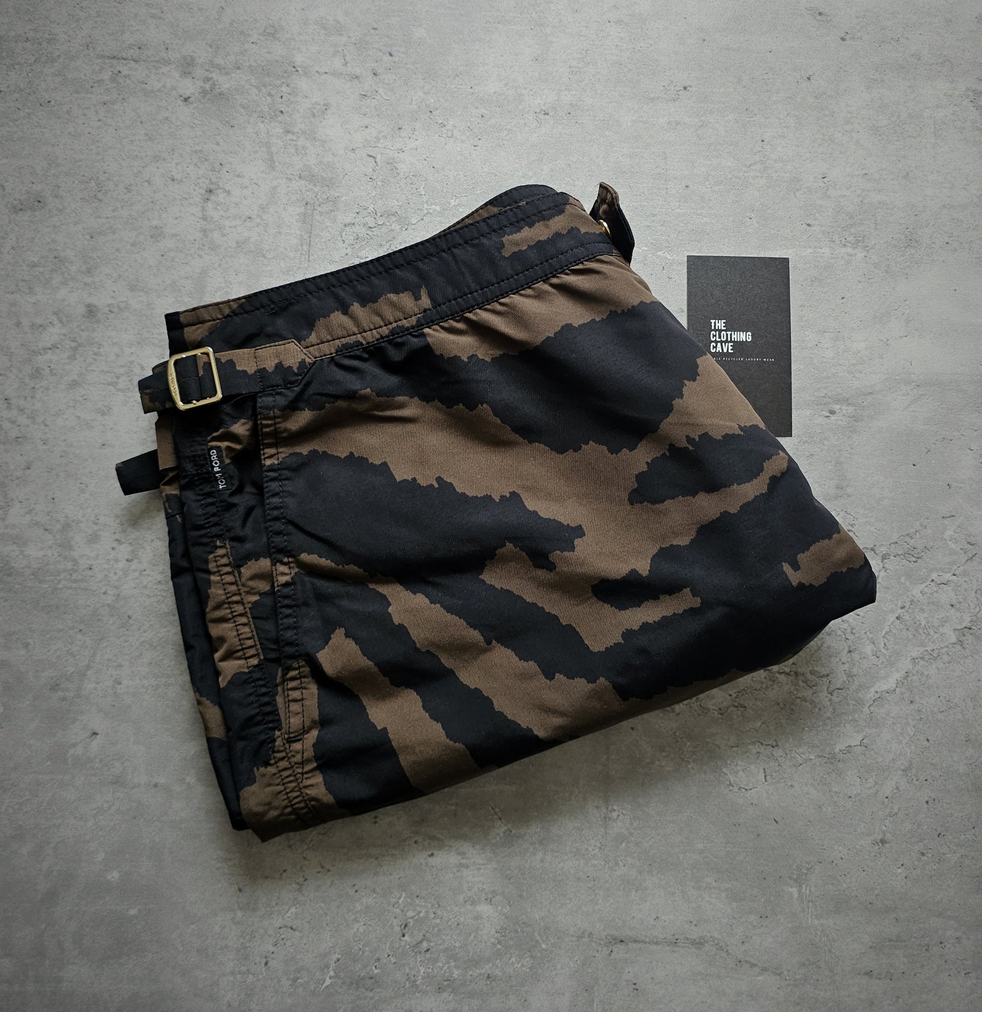 These distinctive swim shorts epitomise a harmonious blend of luxury and performance, as designed by the renowned designer Tom Ford. They are meticulously crafted to achieve a streamlined, tailored fit and exemplify Tom Ford's signature combination of sophistication and audacity, highlighted by a striking zebra pattern. The swim shorts feature a concealed rear zipped pocket and a hook and side adjuster in pale gold. They serve as an exceptional statement piece, suitable for beach or poolside engagements.